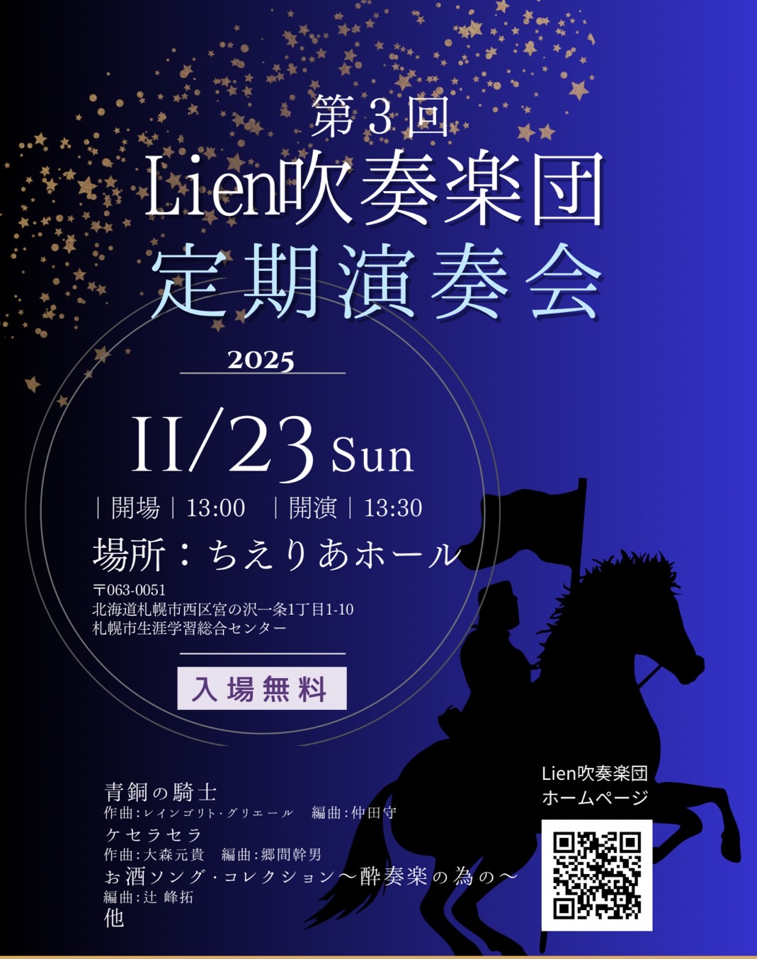2025年10月23日 / 最終更新日時 : 2025年10月7日 s-suiren 5.未分類 【後援】第3回Lien吹奏楽団定期演奏会 日時:2025年11月23日(日)開場13:00 開演13:30 場所:札幌市生涯学習総合センター ちえりあホール 入場料:無料 お問い合わせ先:lien.suisogakudan@gmail.com Lienチラシダウンロード \ 最新情報をチェック /